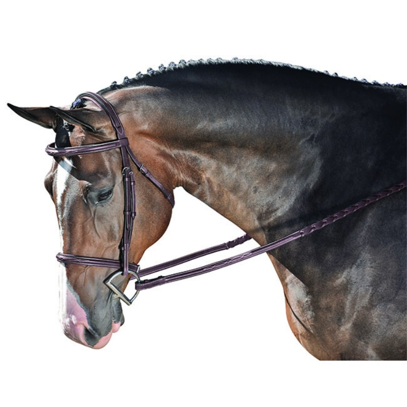 Annice raised hunter bridle with fancy stitching, quick-change padded noseband with buckle guard, 5/8” cheeks, cushioned crown, and matching leather laced reins.